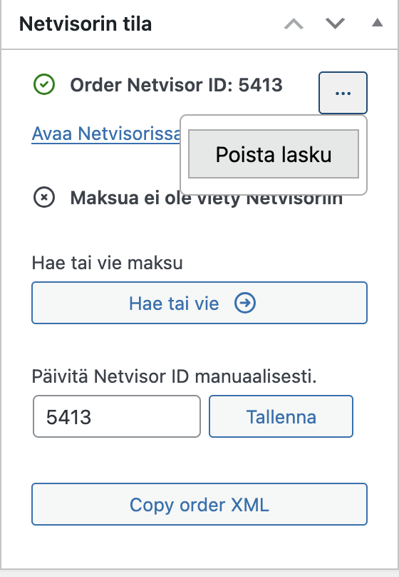 Tilauksen voit poistaa Netvisorista manuaalisesti tilauksen hallintasivulta Netvisorin-tila kentästä painamalla kolmen pisteen takaa nappia Poista lasku/Poista kaikki, riippuen onko tilaukselle viety myös maksusuoritus.